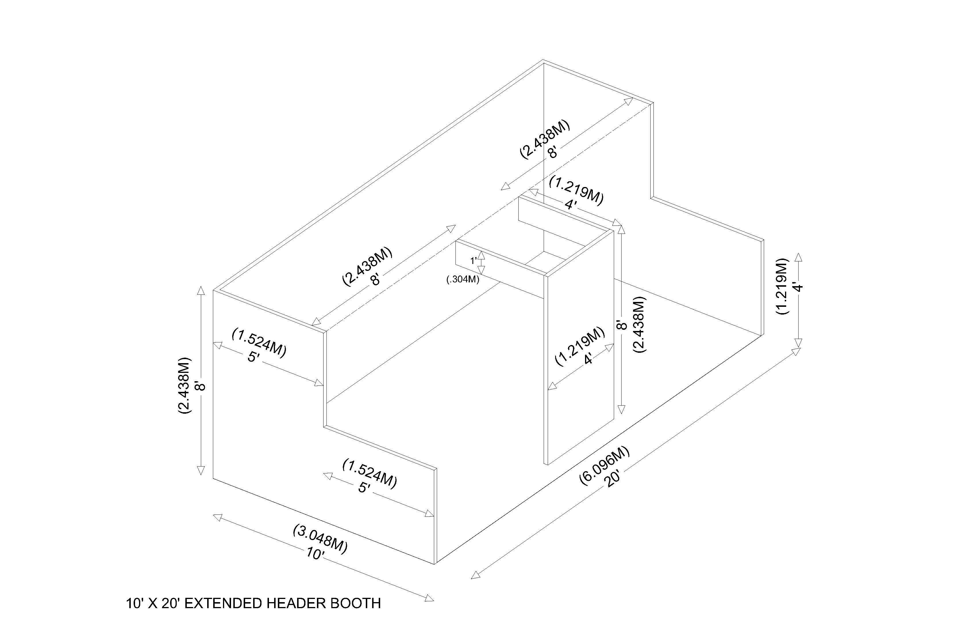 All guidelines for linear booths apply to Extended Header Booths, except the center extended head has a maximum height of 8 ft., a maximum width of 20% of the length of the booth, and a maximum depth of 9 ft. from the backwall.